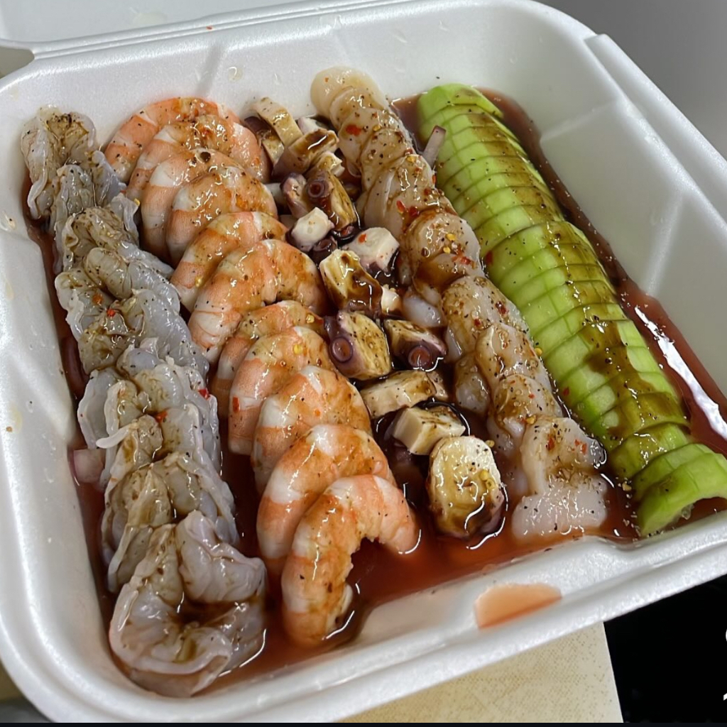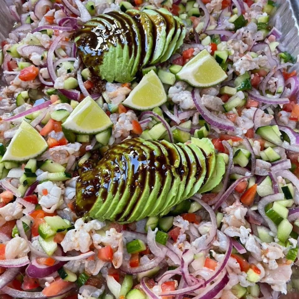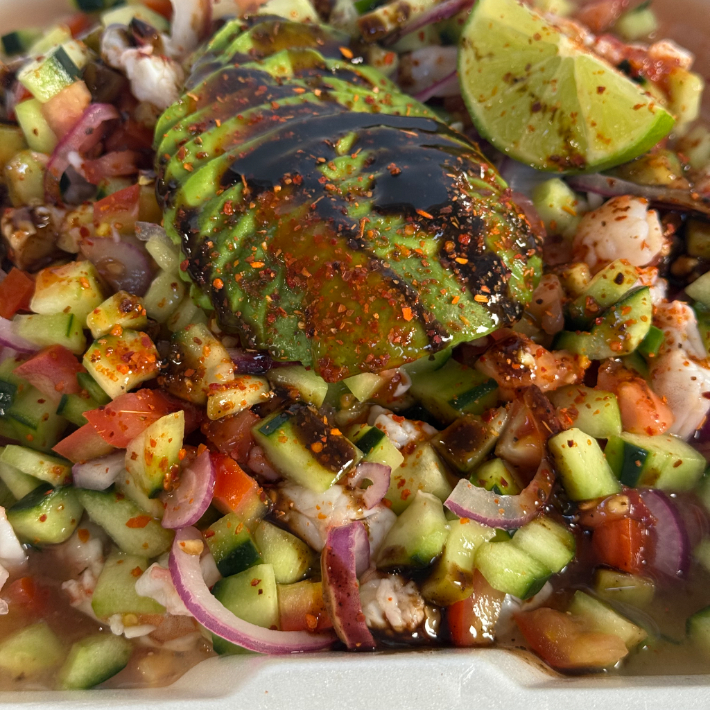 Preparado con Camarón curtido en limón, pepino cebolla morada pepino tomate chiles y nuestro sazón especial acompañado con tostadas y galletas saladas y Nuestra salsa especial Sonora