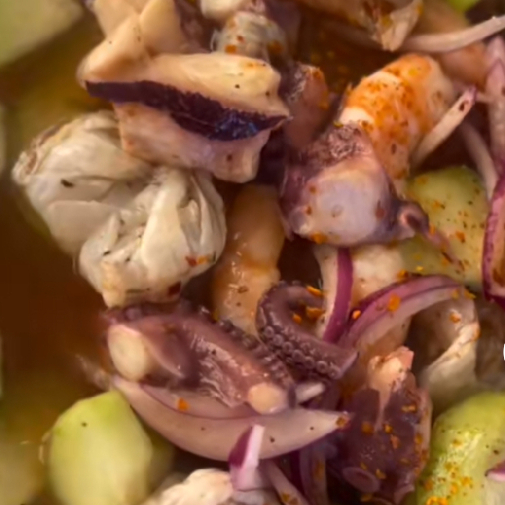 Camarón curtido en limón y nuestra salsa especial Sonora preparado con cebolla morada y pepino acompañado con tostadas *no lleva aguacate