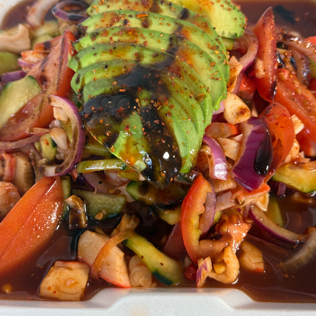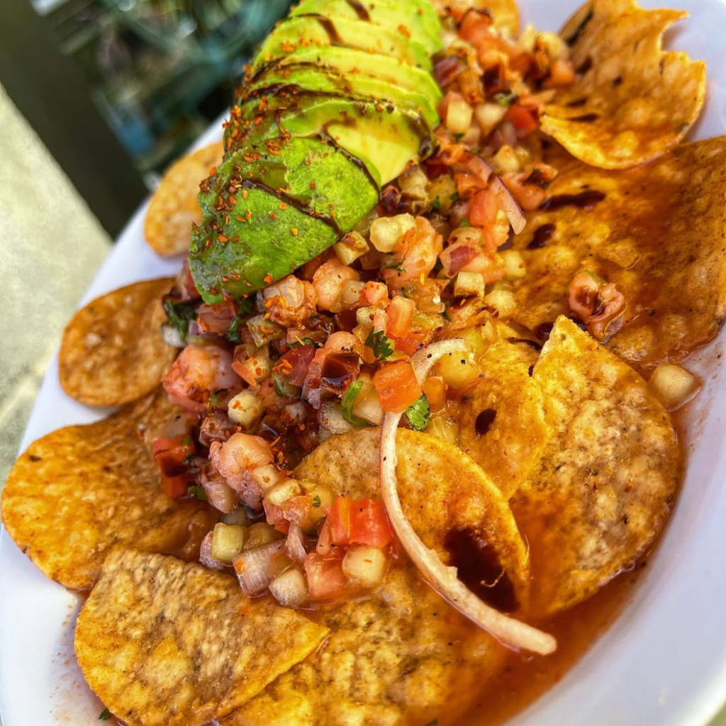Camarón curtido en limón en nuestra salsa enojada, junto con cebolla morada y pepino acompañado con tostadas y aguacate y salsa negra marisquera